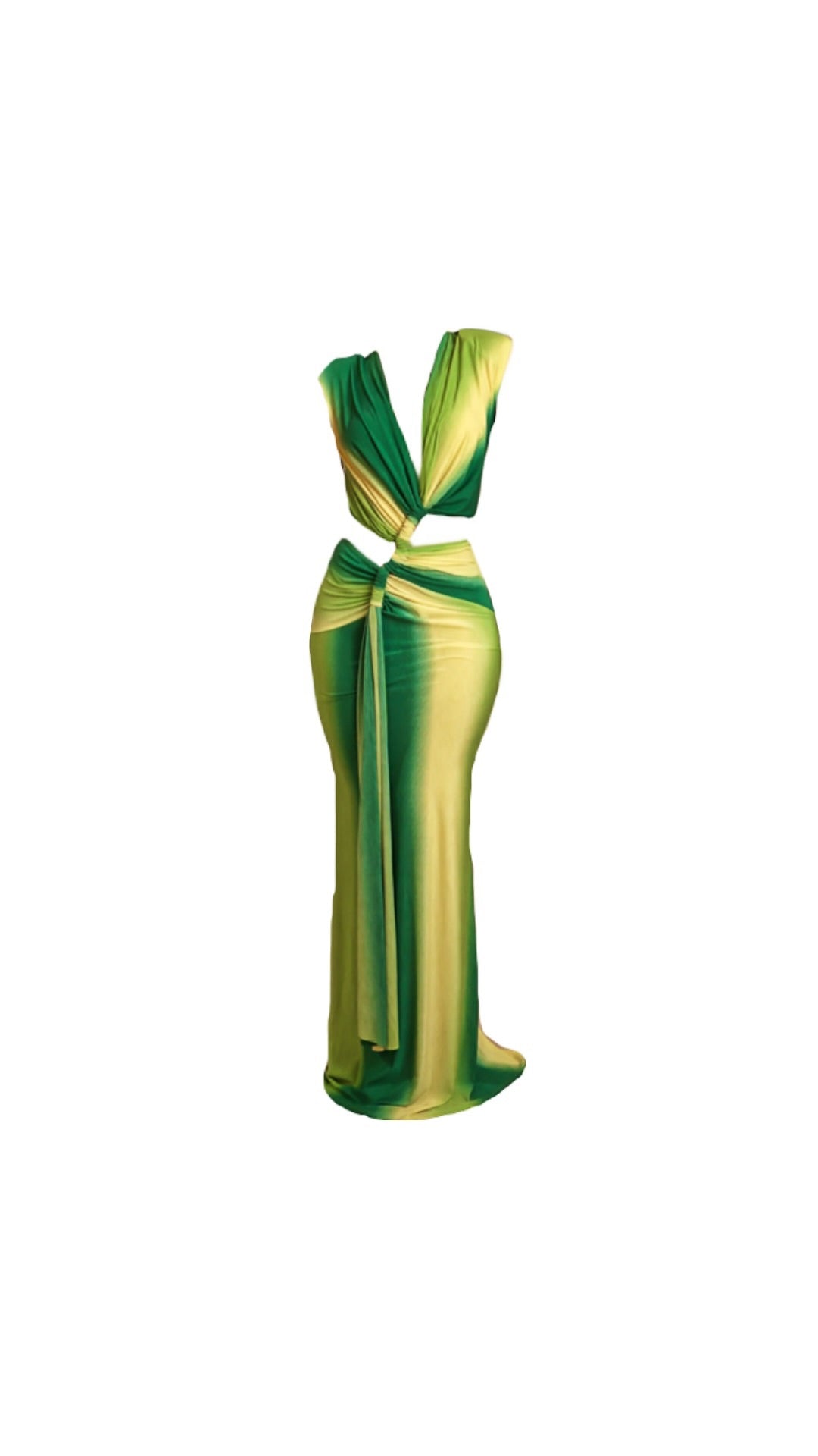 An open back maxi dress with twisting detailing in the front in a ombré mix of green and yellow.